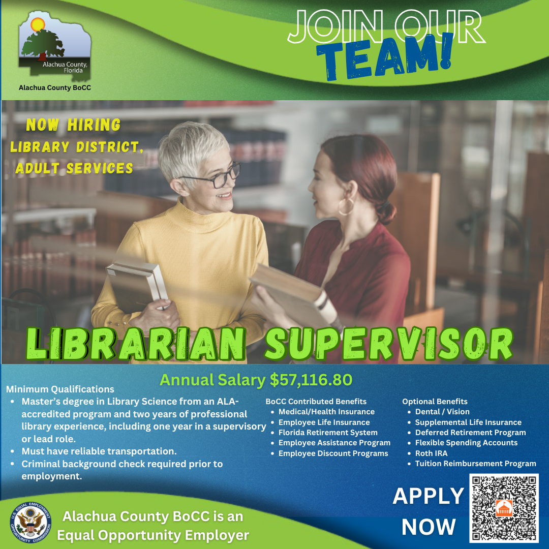 Master's degree in Library Science from a library school program accredited by the American Library Association and two years of professional library experience, including one year of supervisory/leadworker experience. Must have own means of transportation. Successful completion of a criminal history background investigation is required prior to employment.