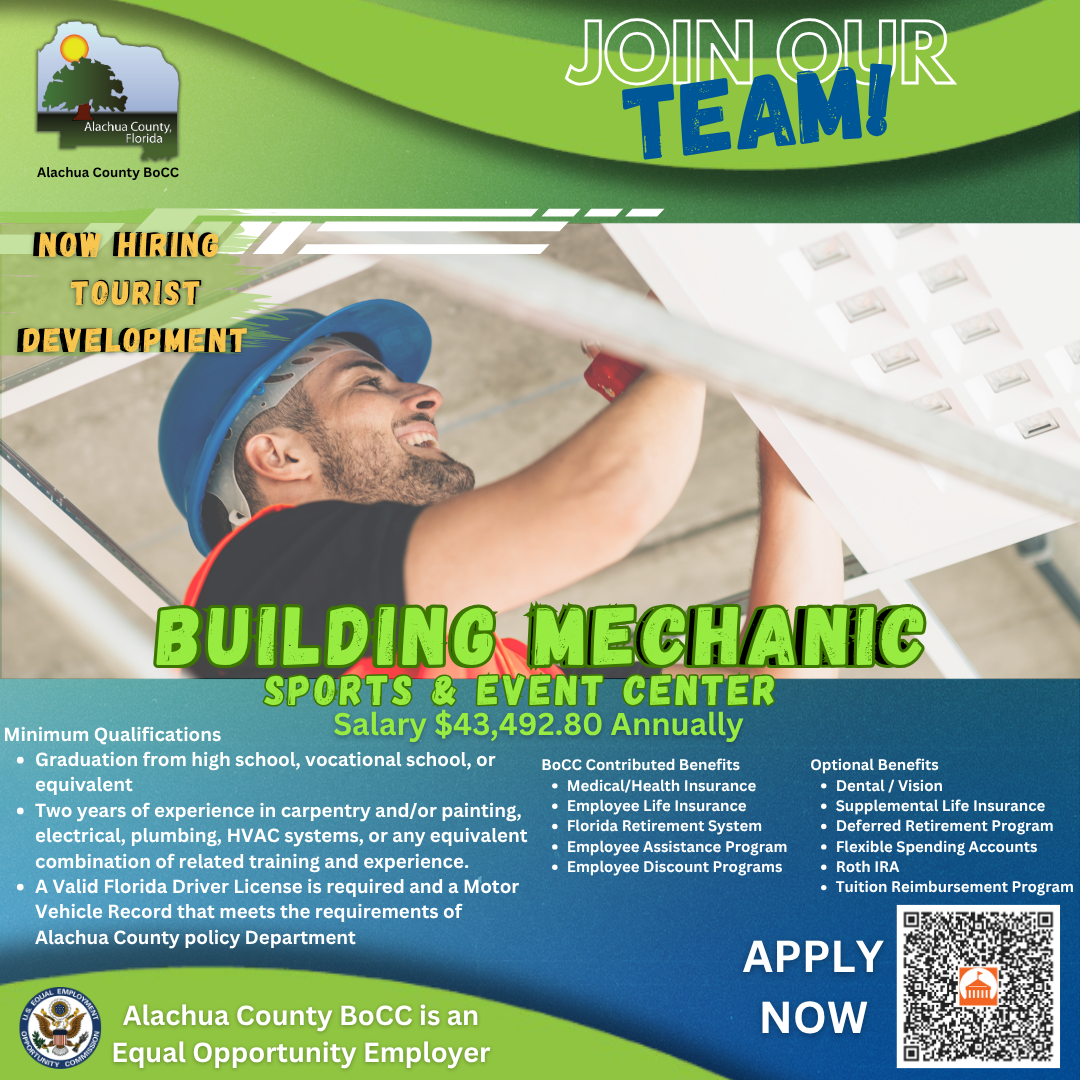 Alachua County is an Affirmative Action/Equal Opportunity employer. Alachua County gives preference in initial employment to eligible veterans and spouses of disabled veterans.