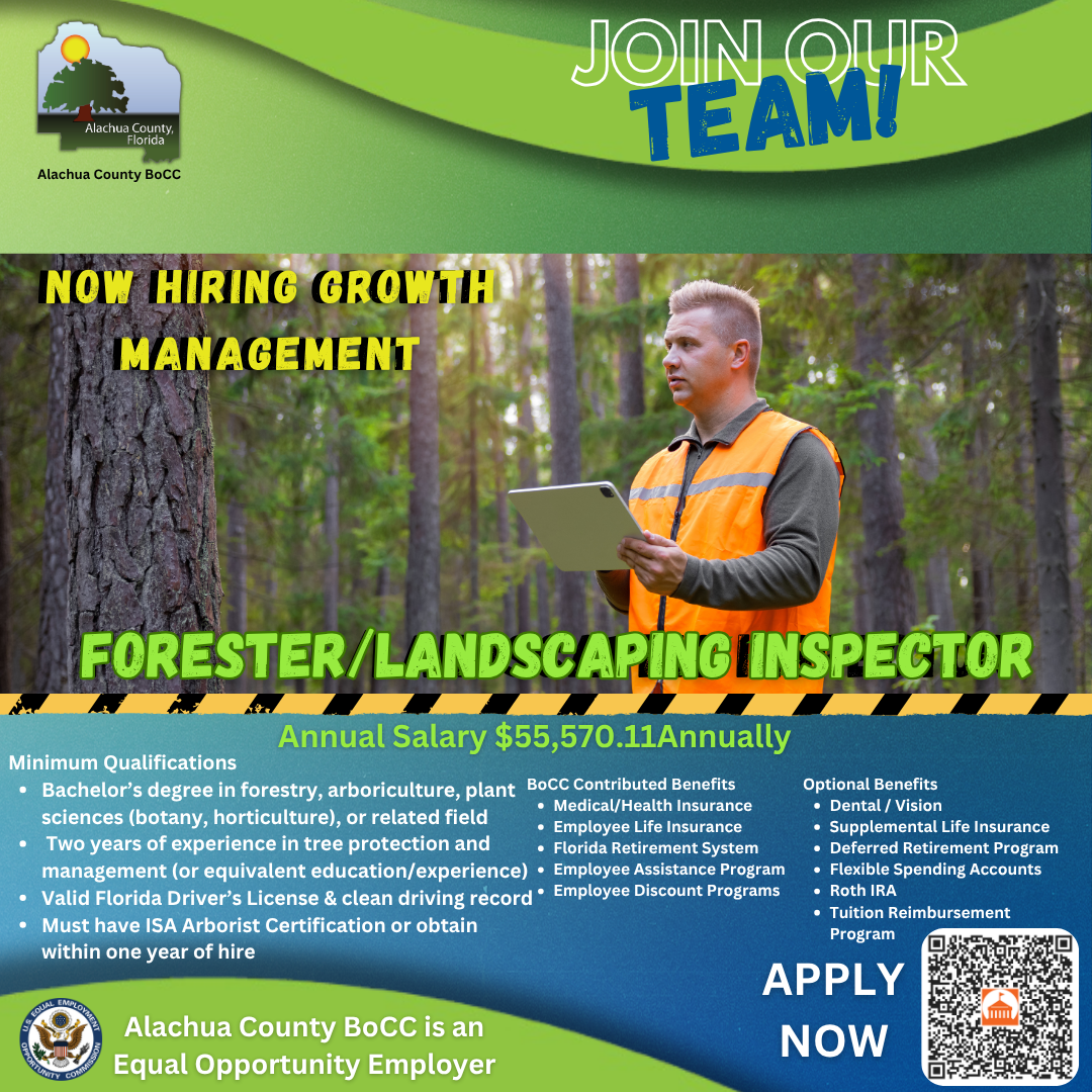 An employee assigned to this classification plans, organizes, manages, and directs the functions associated with the protection of trees and implementation of good forestry and landscaping practices. Responsible for proper implementation of and compliance with the tree protection ordinance and landscaping ordinance of Alachua County.